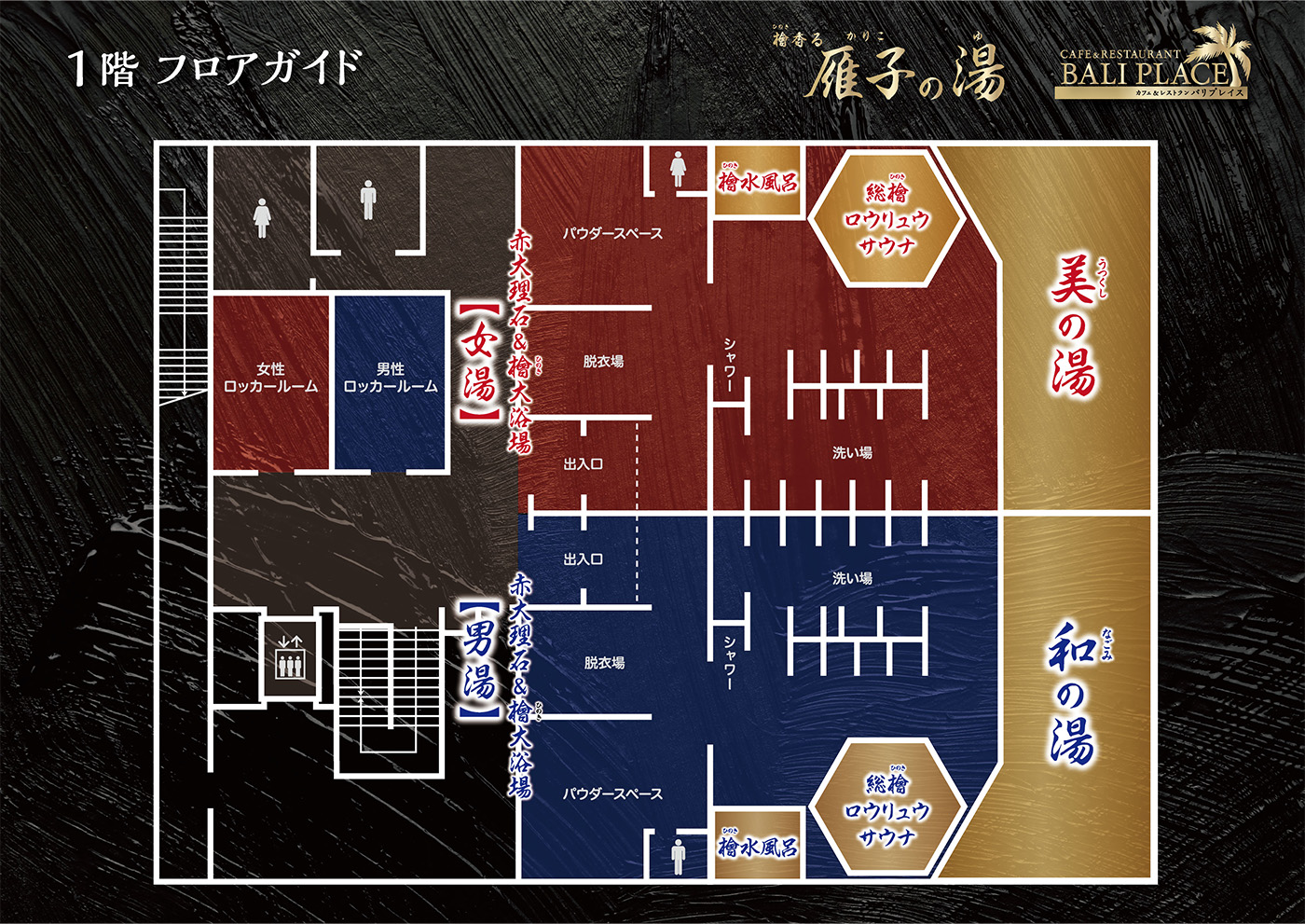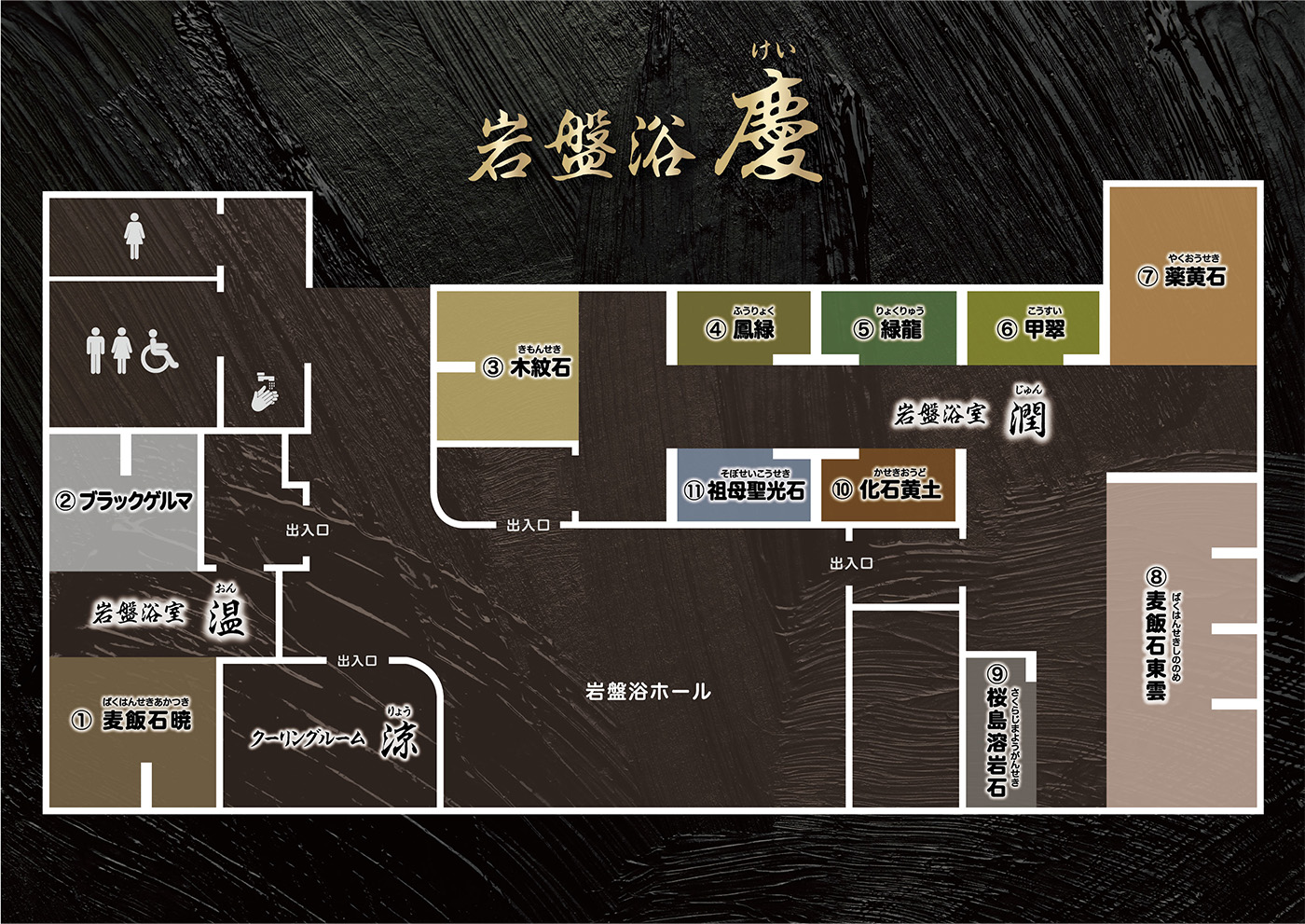 11種類の良質な天然岩石による岩盤浴を楽しむことができます。麦飯石暁(ばくはんせきあかつき)、ブラックゲルマ、木紋石(きもんせき)、鳳縁(ふうりょく)、緑龍(りょくりゅう)、甲翠(こうすい)、薬黄石(やくおうせき)、麦飯石東雲(ばくはんせきしののめ)、桜島溶岩石(さくらじまようがんせき)、化石黄土(かせきおうど)、祖母聖光石(そぼせいこうせき)のそれぞれの薬石効能を実感してください。