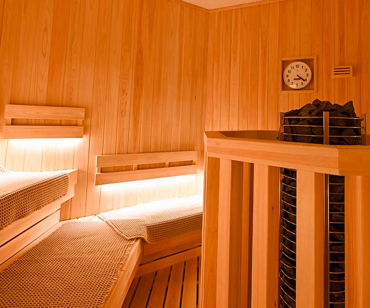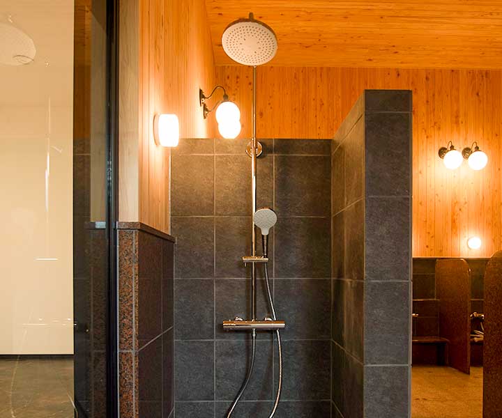 総檜で囲まれた、最新のロウリュウサウナです。水を縦型に積まれたサウナ石にかけ、体感温度の高い熱風を是非体験してください。