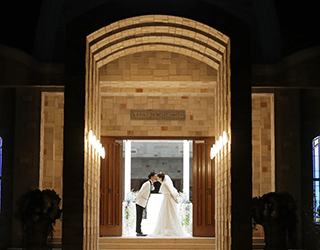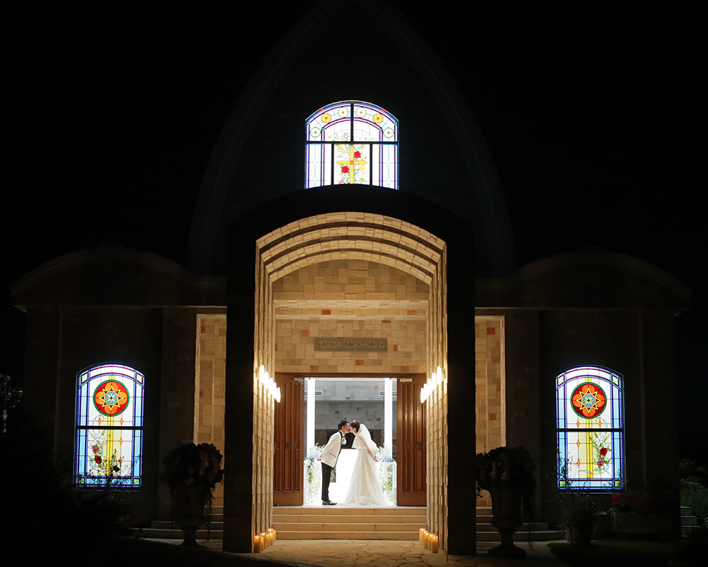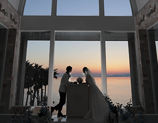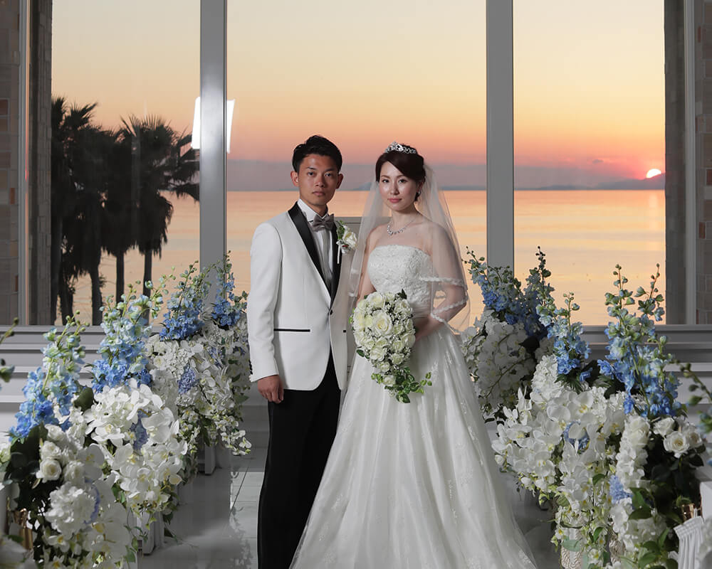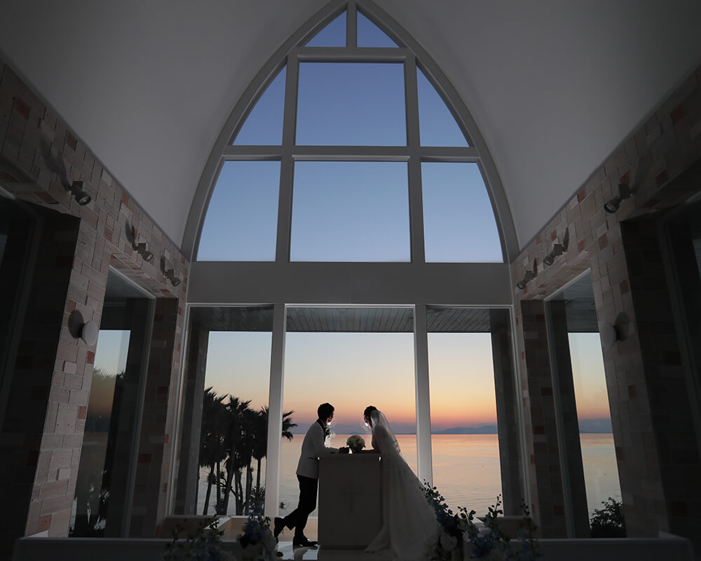 天井高のある開放感たっぷりのチャペルは、関西ではめずらしい海を一望できる造りとなっており、挙式の入場シーンから指輪の交換、そしてキスシーンなど、本物の結婚式と変わらない撮影が可能です。