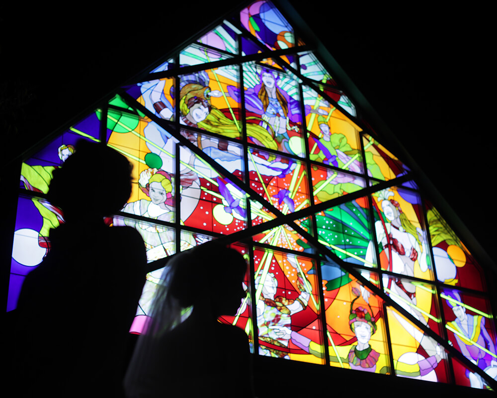 広々としたバンケット(宴会場)は、実際の披露宴にも使用。リオのカーニバルをモチーフとしたステンドグラスが施された屋根と、エンジェル像や色鮮やかな花が咲いているミニガーデンが特長となっています。