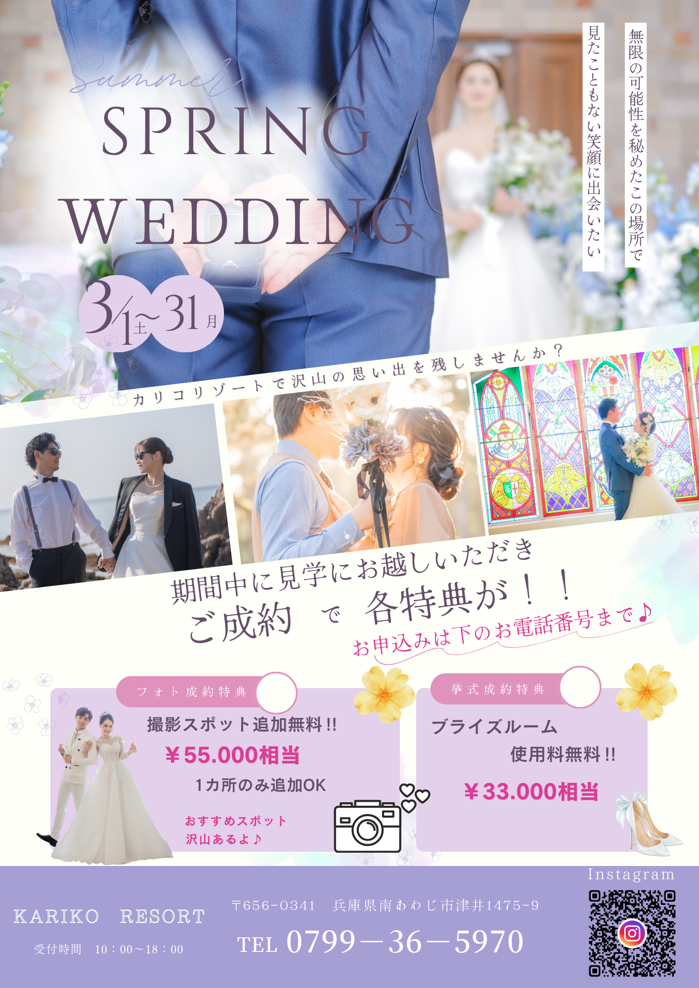 また春色のウエディングドレスやアイテムなど多数取り揃えていますので、ぜひこの機会にカリコリゾートでフォトウェディングをしてみませんか。
