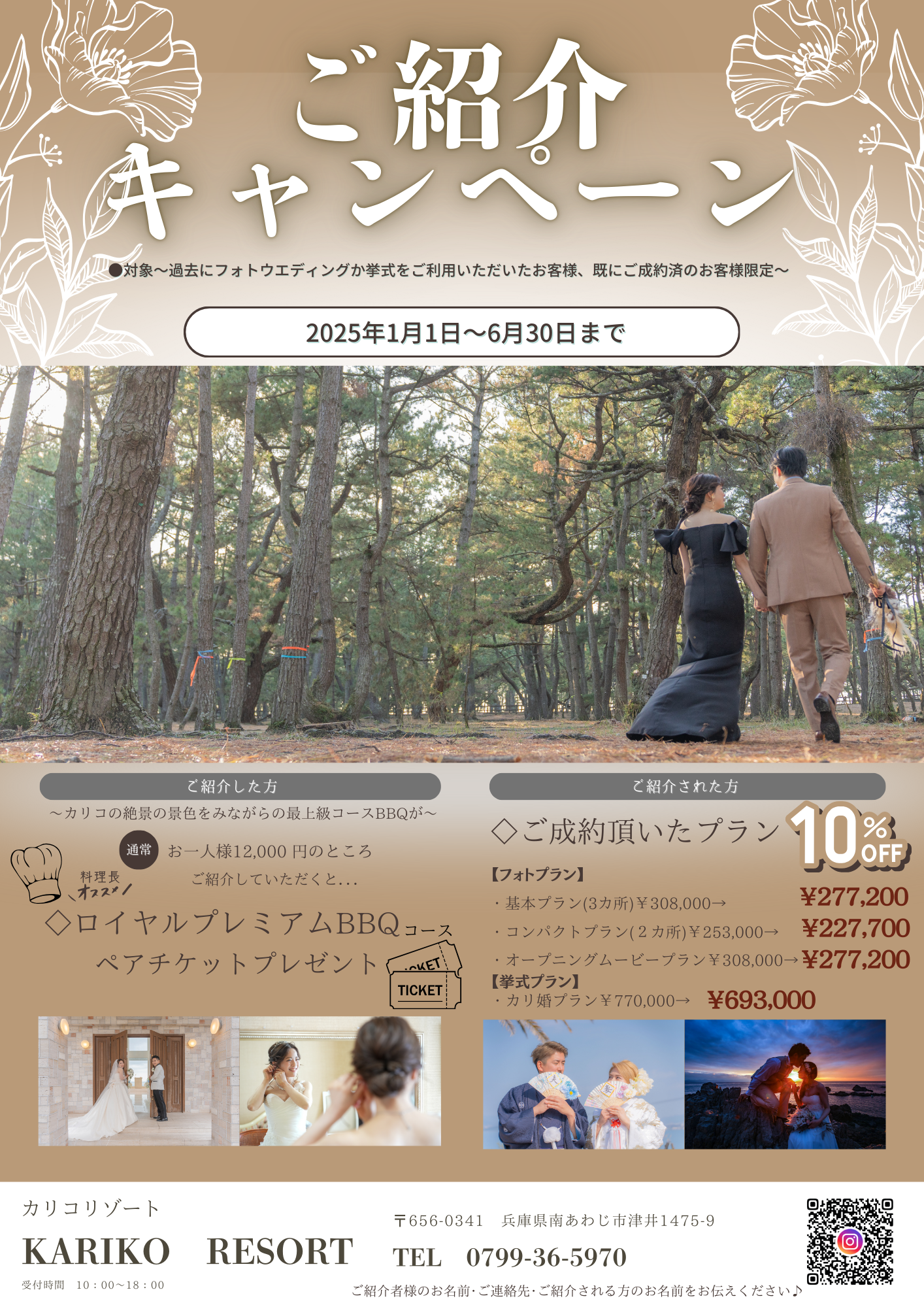 過去にカリコリゾートのフォトウエディングか挙式をご利用いただいたお客様、既にご成約済みのお客様を対象としたキャンペーンとなっております。