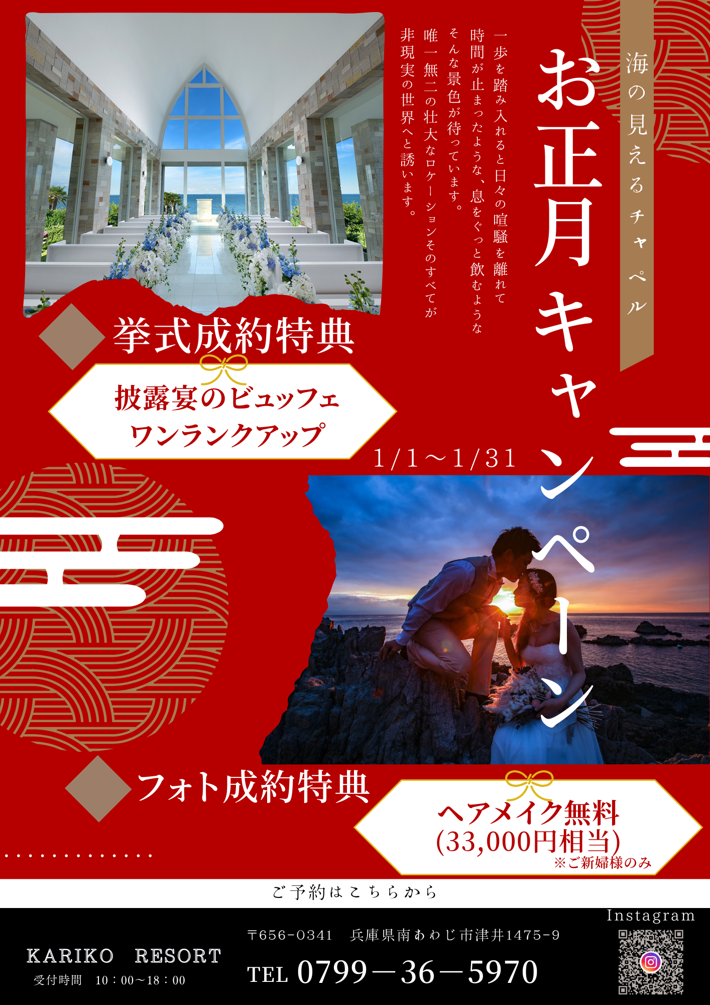 明日2月1日(土)からあたたかい館内の撮影をお得に楽しめるキャンペーンを開始します。この機会にカリコの館内撮影を楽しんでください!!ほっこりウインターフォトウエディングキャンペーンの詳細はこちらから>>