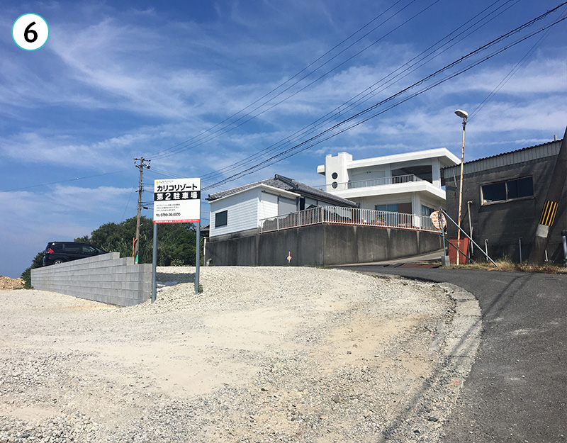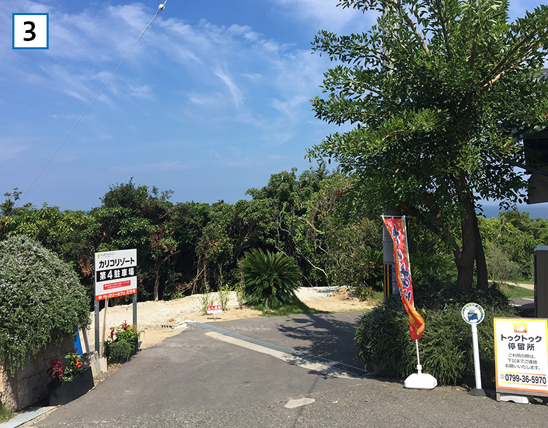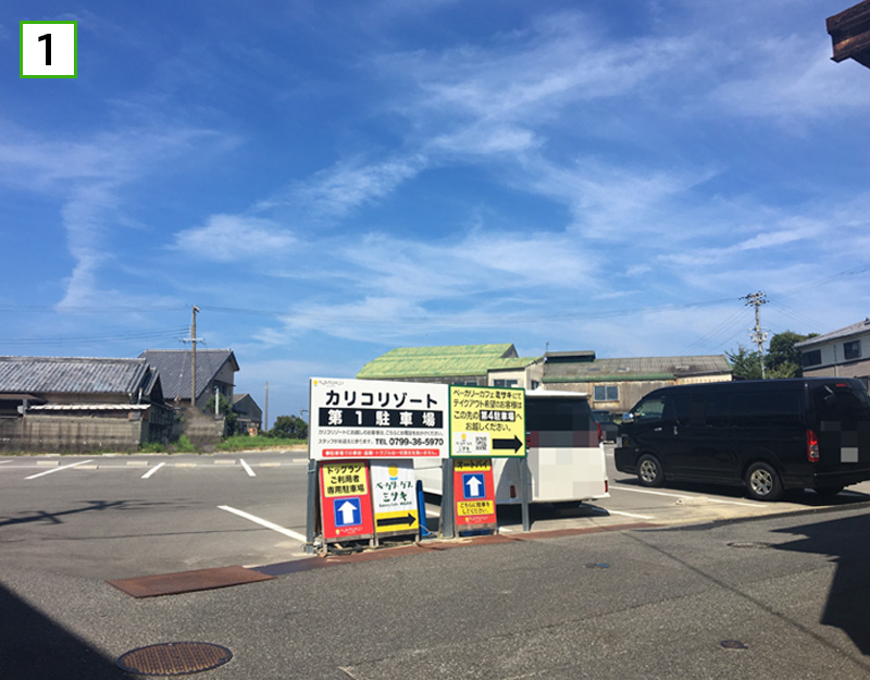 第1駐車場、第2駐車場に駐車後、カリコリゾート(TEL:0799-36-5970)へご連絡下さい。