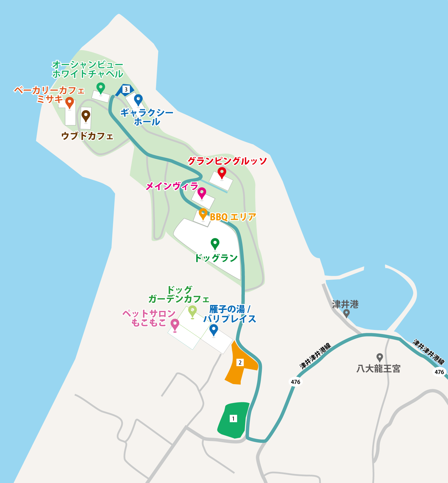 ●ベーカリーカフェミサキ、カリコフードロッジへ行かれる方は、第1駐車場手前の道を右折し、ドッグラン、メインヴィラを通り過ぎ、ホワイトチャペル右手側の第4駐車場をご利用下さい。